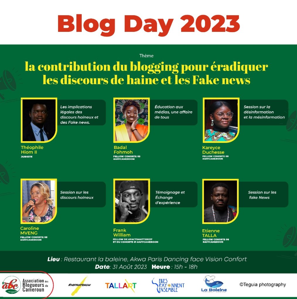 Sous le thème la contribution du blogging pour éradiquer les discours de haine et les fake news, ce meetup réuni, le temps d’une fin de journée,divers acteurs du monde de la communication, blogueurs, créateurs de contenus, journalistes, stagiaires en journalisme et cyber curieux. Pour édifier ce beau monde, un panel de choix pour donner de l’éclat aux échanges :Badal Fohmoh, Caroline MVENG, Theophile Hiom II (blogueur et juriste), Marie Tiambou (blogueuse),Étienne TALLA, Frank William Batchou.
