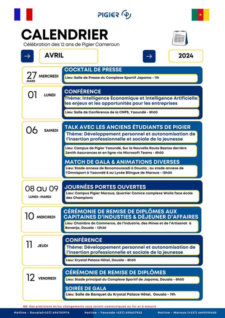 Du 10 au 12 avril 2024, l’an 12 de Pigier Cameroun se célèbre sous le thème « Développement personnel et autonomisation de l’insertion professionnelle et sociale de la jeunesse » . Pour cet événement d’envergure ,du faste, des partages d’expériences et remise de diplômes seront au menu. Face à la presse,le top management de l’institution a dévoilé les contours de cette célébration