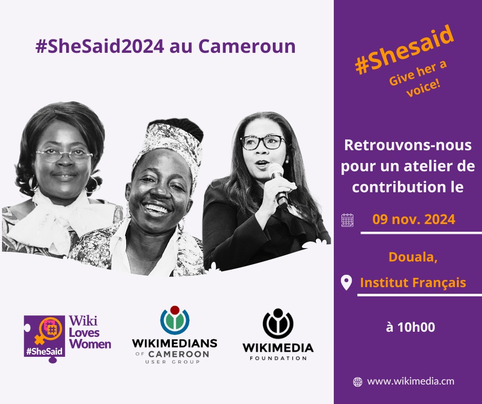Ce samedi 9 novembre 2024, la deuxième session des ateliers de création de contenus dans le cadre de la campagne #SheSaid s’est tenue à l’Institut Français de Douala à 10h00. Ces ateliers sont ouverts à tous ceux qui souhaitent apprendre à contribuer efficacement à Wikiquote, en enrichissant la plateforme de citations féminines. Ce sera un moment d’échange, de formation et de réflexion collective sur la manière de donner plus de visibilité aux femmes dans le monde numérique.
